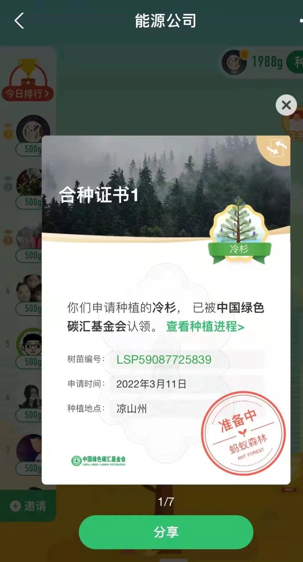 “一花一草皆生命,一枝一葉總關(guān)情?!痹缭?019年起,公司就通過(guò)支付寶螞蟻森林組建了一只“能源公司云種樹(shù)小隊(duì)”,如今隊(duì)伍人數(shù)越來(lái)越壯大,已有59位隊(duì)員,截止目前,在酒泉、大理、邯鄲等地,種下了冷杉、側(cè)柏、云杉、胡楊等7棵大樹(shù)。3月11日,在小伙伴的共同努力下,我們又種下了一棵冷杉樹(shù),該樹(shù)被中國(guó)綠色碳匯基金會(huì)認(rèn)領(lǐng),將種植到?jīng)錾街莸貐^(qū)。